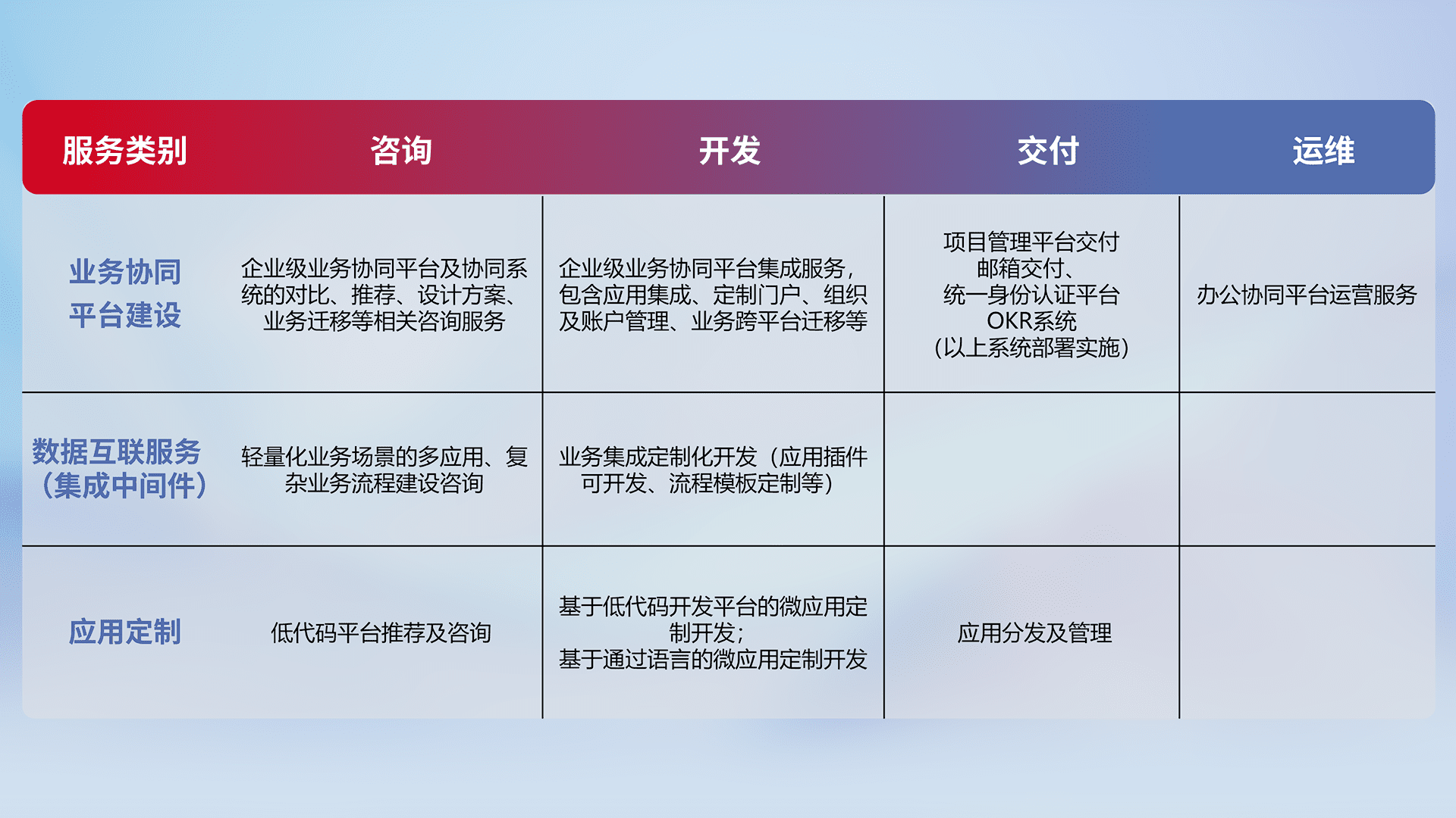 针对钉钉、、企微、、、、IDaas等平台级产品提供产品的规划、、、方案、、、交付、、、定制化开发等服务,,,实现如统一协同办公、、、智能客户服务、、混合会议管理、、、、智能数据查询、、、、等业务场景,,,实现数字化转型。。。