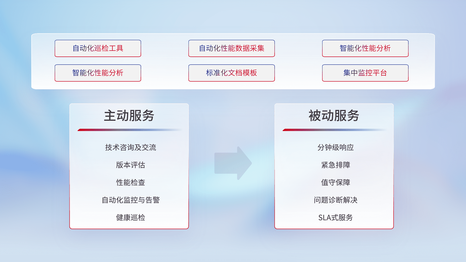 智能化工具和标准化文档,,,,保障服务质量,,,,提供主动服务(包含技术咨询、、、版本评估、、、、性能检查、、自动化监控与告警、、健康巡检)和被动服务包含(分钟级响应、、、、紧急排障、、、、值守保障、、、问题诊断解决、、、、SLA服务)。。。